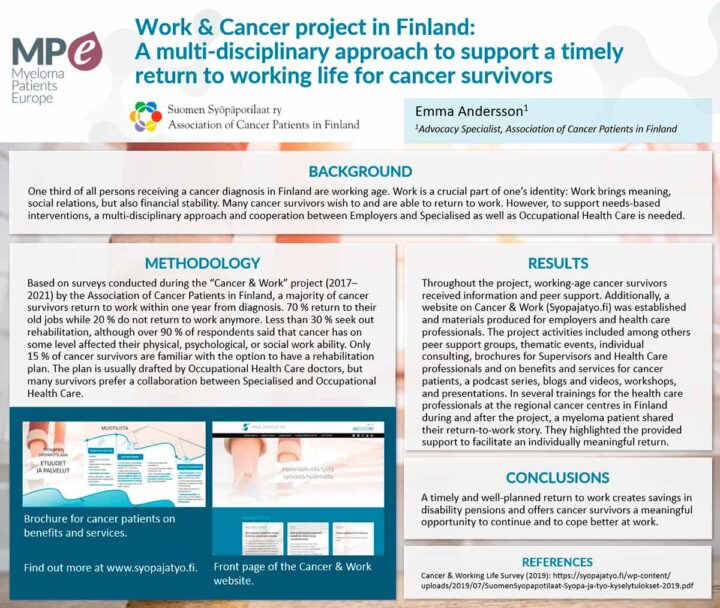 Meiltä pyydetään myös puheenvuoroja, postereita tai vaihdamme ideoita puolin ja toisin muun muassa lääkelausunnoista ja eri maiden HTA-käytännöistä. Joillakin järjestöillä on myös pidempiä opintokokonaisuuksia, joihin suomalaisetkin potilaat voivat hakea – kuten esimerkiksi Myeloma Patients Europen (MPE) Advocate Development Program.
